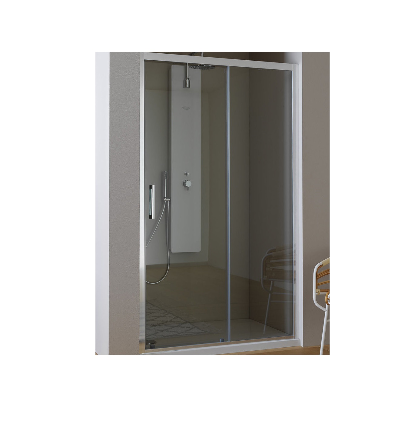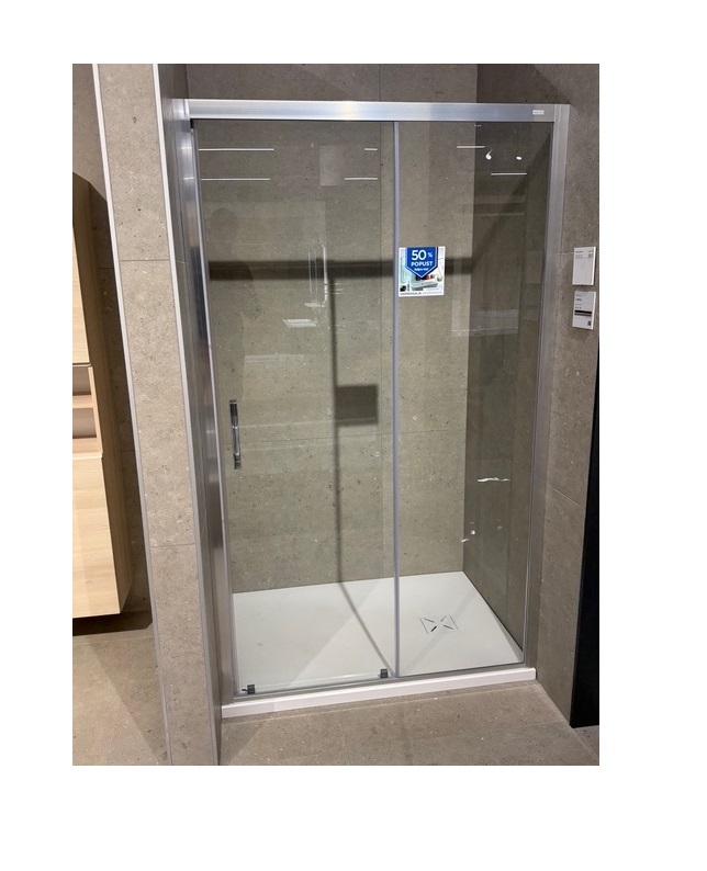 Samostojna tuš vrata, iz prozorno kaljenega stekla, s Silver Brill profilom, z enostranskim odpiranjem. Z možnostjo postavitev dodatne stene samo levo, samo desno ali levo in desno